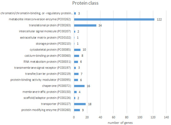 The largest part of proteins with differential abundance belonged to metabolite interconversion enzymes (122), following by translational proteins (34), transporters (18), chaperons (16), and cytoskeletal proteins (10) (Figure 6).