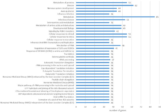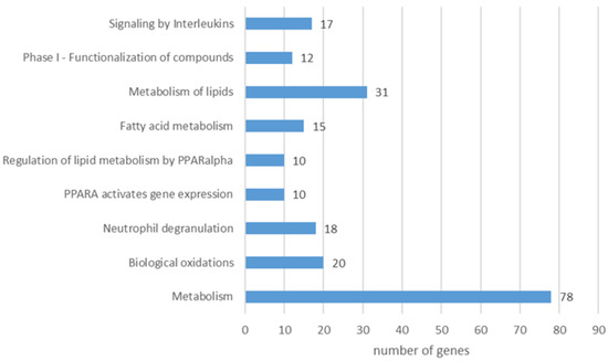 The Reactome pathway analysis of the liver proteins differing in abundance revealed 227 pathways (FDR < 0.05). After reducing the total number by including only those with a minimum of 35 proteins, 37 remained (Supplementary Table S2). Among the most representative were those associated with metabolism (metabolism in general, metabolism of proteins, and metabolism of amino acids and derivatives), immune system (cellular responses to stress, cellular responses to stimuli, infectious disease, and innate immune system), translation, and related pathways (metabolism of RNA, translation, rRNA processing, and eukaryotic chain elongation), signaling (signaling by ROBO receptors) and others. When analyzing only proteins with a lower abundance in the infected group compared to the control, the enrichment was present for 36 pathways (FDR < 0.05, minimum 35 genes per pathway), with the most distinguished ones being: metabolism (85 genes), metabolism of proteins (55 genes), cellular response to stress (55 genes), infectious disease (53 genes), metabolism of RNA (48 genes), and translation (36 genes) (Figure 7). A closer look at proteins with higher abundance in the infected group revealed nine pathways (FDR < 0.05, minimum 10 genes per pathway): metabolism (78 genes), metabolism of lipids (31 genes), biological oxidations (20 genes), neutrophil degranulation (18 genes), signaling by interleukins (17 genes), fatty acid metabolism (15 genes), phase I - Functionalization of compounds (12 genes), PPARA activates gene expression (10 genes), and regulation of lipid metabolism by PPAR alpha (10 genes) (Figure 8).