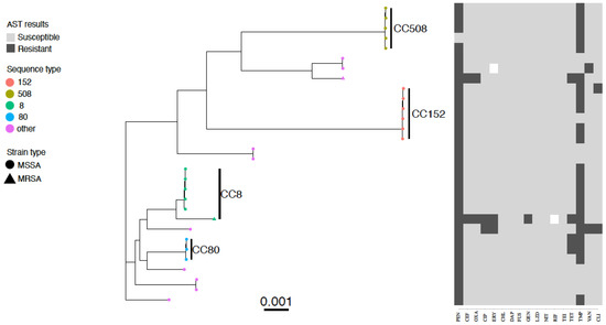 Paired-end Illumina reads were mapped to the S. aureus reference genome ST22 strain HO 5096 0412 (accession number HE681097) using Snippy v4.6.0 (https://github.com/tseemann/snippy, accessed on 31 October 2022). Whole-genome alignments were created by keeping a version of the reference genome with only substitution variants replaced (i.e., SNPs but not indels) using Snippy’s.consensus.subs.fa output files. The S. aureus species core-genome had been previously derived [32] from a collection of 800 S. aureus from multiple host species [33]. The portion of the reference genome (2.83 Mb) corresponding to the core genome (1.76 Mb) was kept from whole-genome alignments and used to generate maximum likelihood trees using IQ-TREE v1.6.10 with default settings. The resulting core-genome phylogeny was plotted with isolate metadata using ggtree v.3.0.4 [34] and ggtreeExtra v.1.2.3 on R v4.1.0 [35].