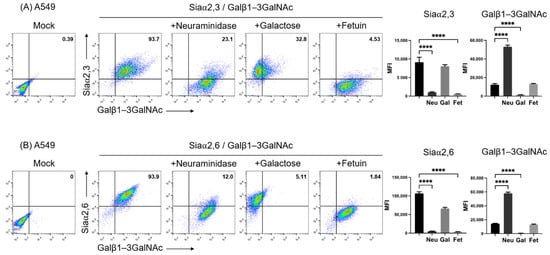 Two-color flow cytometry analysis of the expression of (A) Siaα2,3 and Galβ1-3GalNAc and (B) Siaα2,6 and Galβ1-3GalNAc on A549 cells by means of binding of SNA, MAAII, and PNA lectins. The effect of treatment of the cell surface with neuraminidase, blocking of PNA binding with galactose, and lectin absorption with fetuin is shown. The percentage of positive cells in the upper right quadrants is shown. The mean fluorescence intensity of triplicates in a representative experiment is shown on the right. MFI, mean fluorescence intensity; Gal, galactose; Neu, neuraminidase; Fet, fetuin. Significant differences are marked with asterisks (**** p < 0.0001, one-way ANOVA).