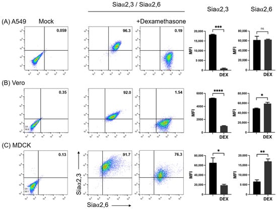 Effect of treatment of cells with dexamethasone (DEX)on the expression of Siaα2,3 and Siaα2,6 on (A) A549, (B) Vero, and (C) MDCK cells. FMI, mean fluorescence intensity; DEX, dexamethasone; ns, non-significative difference. Significant differences are marked with asterisks (*, p < 0.05, **, p < 0.01, ***, p < 0.001, ****, p < 0.0001; Student’s t-test).