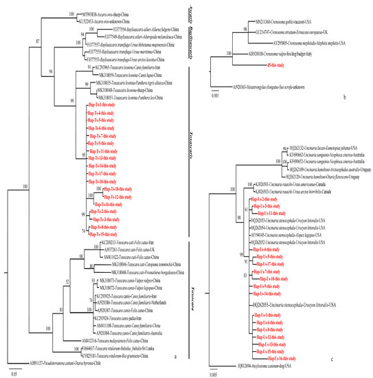 - Xie, Y.; Chen, Z.; Zhao, B.; Niu, L.; Gu, X.; Yang, G. Characterization of Roundworms from Eleven Species of Captive Wild Canin and Feline Animals, in Sichuan Provinces, China, Using Mitochondrial and Nuclear Genes. In Proceedings of the 11th China Symposium on Young Workers of Parasitology, Kunming, China, 10 August 2018. (In Chinese). [Google Scholar]