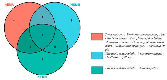 - Morand, S.; Bouamer, S.; Hugot, J.-P. Nematodes. In Micro Mammals and Macroparasites: From Evolutionary Ecology to Management; Serge, M., Salah, B., Jean-Pierre, H., Eds.; Springer: Berlin/Heidelberg, Germany, 2005; Chapter 4; pp. 63–80. [Google Scholar]