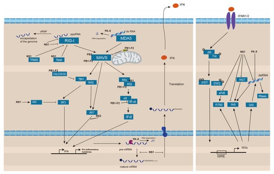 As discussed above, IAVs suppress cellular gene expression via various mechanisms mainly through NS1 and PA-X proteins. The expression of IFN genes will be suppressed by these mechanisms.