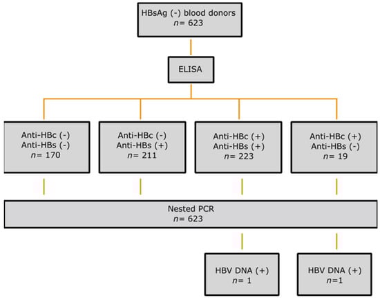 This cross-sectional study was carried out at the Department of Blood Transfusion, 108 Military Central Hospital, Hanoi, Vietnam. For this study, a total of 623 HBsAg-negative serum samples were collected from blood donors on 2 October 2021 and 12 October 2021. The study cohort was collected on two independent blood donation days, as mentioned above. All healthy adult volunteers from northern Vietnam were representative of this cohort and were predominantly from the Kinh ethnic group. No chronic diseases were recorded in the medical history. However, eligibility for blood donation was determined by the doctors of the transfusion department based on their routine guidelines. Demographic data and written informed consent were obtained from all donors. In accordance with standard hospital practice, the samples were serologically tested for HIV, HCV, and HBV (HBsAg) and were confirmed negative (VITROS Immunodiagnostic Products HBsAg, Anti-HIV 1+2, Anti-HCV (Ortho-Clinical Diagnostic, Felindre Meadows, UK). All blood donor samples were additionally tested for anti-HBs and anti-HBc antibodies and HBV DNA (Figure 1).