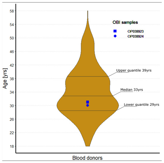We found by nested PCR that HBV DNA was present in two samples (0.3%; in OP038923 and OP038924). The OBI positive blood donors were 31 and 30 years old (Figure 2). As expected, both OBI carriers were seropositive and had anti-HBc antibodies; in addition, the OP038924 individual was positive for anti-HBs. It is evident that OBI is more likely to be found in people with anti-HBc positive but anti-HB-negative serology profiles [,], however, we found only 1 OBI positive case out of 19 samples in this group (Figure 1).