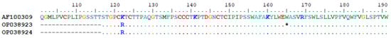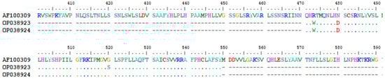Multiple nucleotide mutations were identified, using sequence AF100309 from HBVdb as the reference. Nucleotide substitutions C510T, A521G, and A531G were observed in both Vietnamese OBI carriers, while G651A was only observed in OP038923. Due to the overlapping nature of the viral Open Reading Frames (ORFs), these single nucleotide polymorphisms lead to five amino acid changes in both the S (Reading Frame 1) and the P (Reading Frame 2) genes. For the S gene, mutation K122R in the MHR was observed for both samples, while W165X, resulting in a stop codon, was only present in OP038923 (Figure 4). For the P gene, three amino acid changes were observed, R473W and N480D in both samples and G520S only in OP038923 (Figure 5).