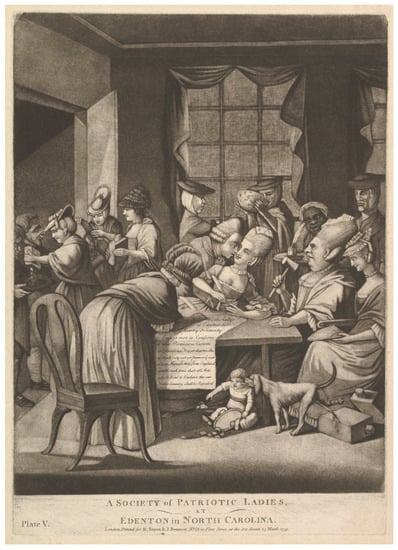 A British satirical drawing, published in response to the Edenton female tea boycott. Dawe P (1774). A society of patriotic ladies, at Edenton in North Carolina. R. Sayer & J. Bennett, London (Public Domain).