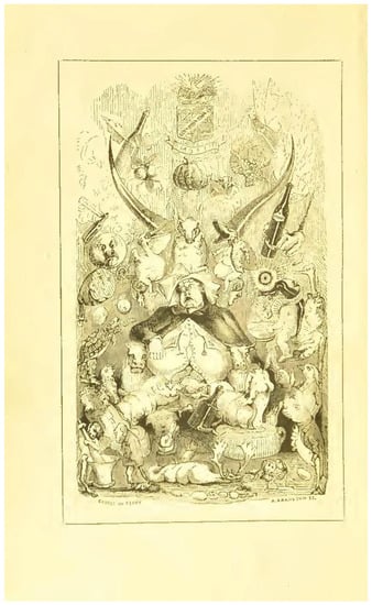 The epidemic of gastrointestinal disturbances that arose from urbanisation and industrialisation was claimed the most common medical problem by the Medico-chirurgical Review in 1826 [45]. In 1838, the Dublin Journal of Medical Science stated that stomach diseases were a national disease and “the prime staple of the medical art” [46]. The temperance literature of the 1840s claimed that it was a new phenomenon for the working class [47]. This observation stems from the fact that gastrointestinal abnormalities were treated among the upper class in the 18th century and were linked to overeating, overthinking, and sedentary lifestyle [48]. In the late 19th century, indigestion remained a “fashionable” disease, with an intensive advertisement for digestive drugs [49]. However, the phenomenon was observed across all social classes, which could reflect major social changes and a changing approach to health within the whole society. The physicians encouraged the English nation to eat regularly, slowly, healthy and in moderate amount, and to avoid alcohol. The most popular of those publications were Memoirs of a Stomach by Sydney Whyting (1853). The main character was Mr. Stomach, who was suffering from unhealthy eating habits and poor emotion management of its owner [50] (Figure 4).