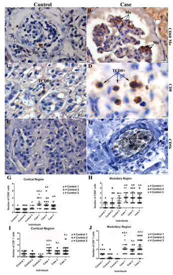 Characterization of cellular subpopulations in the renal tissue and quantification: (B) Detection of macrophages (CD68+ Mø cells) in the renal tissue of Case 3 in the cortical region. (D) Renal tissue from a Case 3 with expression of CD8+ T cells in the medullary region. (F) Expression of CD56+ cells in circulating NK cells in the medullary region in Case 2. (A,C,E) Control tissue with little or no expression of the markers used. (G,H) Quantification of CD68+ Mø cells. (I,J) Quantification of CD8+ T cells. Mø—Macrophage; TCD8+—CD8+ T lymphocyte; NK—Natural Killer Cells. For the statistical analysis, n = 3 was used for controls and cases. Controls 1–3 and cases 1–3 each represent a single and different patient. Mann-Whitney test and t-test was used. Data are represented as mean ± SDM. The letters a, b and c indicate differences that are statistically significant between individual specimens (p < 0.05) Mø—Macrophage; TCD8+—CD8+ T lymphocyte; NK—Natural Killer Cells.