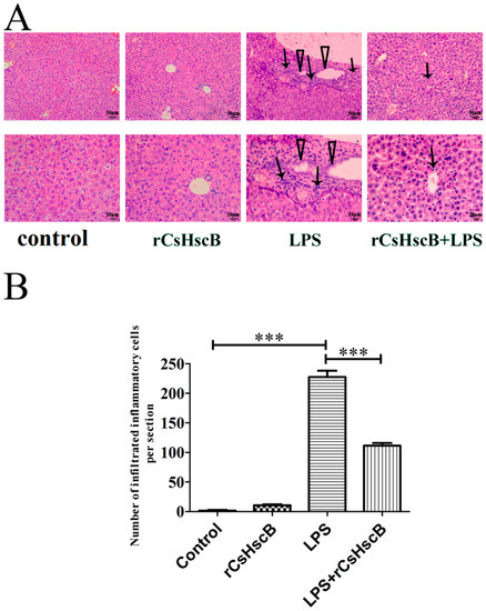 Serum AST and ALT were determined at 12 h after LPS treatment with or without rCsHscB pretreatment in mice. The levels of serum AST and ALT were both significantly increased in LPS-treated mice compared with the control group (Figure 2A,B, p < 0.001). However, rCsHscB treatment restrained the levels of AST triggered by LPS, and there was a statically significant difference between the LPS-stimulated group and rCsHscB treatment group (LPS+ rCsHscB group, p < 0.01, Figure 2A). For the serum ALT, the level of ALT was slightly decreased by rCsHscB treatment after LPS-stimulated mice, and this was not statistically different from LPS-stimulated mice (Figure 2B).