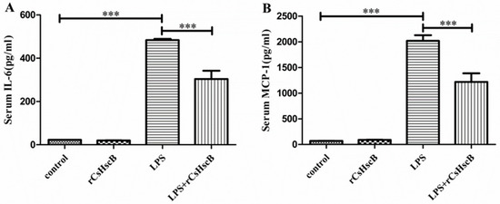 rCsHscB reduces the secretion of serum IL-6 and MCP-1 in sepsis-associated acute liver injury mice induced by LPS. Mice were grouped, including the control group, rCsHscB group, LPS group, and LPS + rCsHscB group. The sera of the mice were collected after LPS treatment for 12 h, and the concentrations of IL-6 (A) and MCP-1 (B) in the sera were determined by ELISA. *** indicates that p value is less than <0.001, compared with indicated group.