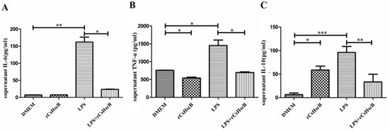 In the present study, the anti-inflammatory or proinflammatory properties of rCsHscB were assessed using a macrophage cell line RAW264.7. The concentrations of IL-6, TNF-α, and IL-10 in the supernatant of RAW264.7 stimulated with medium, rCsHscB, LPS, or LPS + rCsHscB were evaluated. For IL-6 and TNF-α production, rCsHscB alone could not induce an increased level, compared with a medium group (Figure 4A,B, p > 0.05), suggesting that rCsHscB might have no proinflammatory effects, and the effects of endotoxin contamination during the preparation of rCsHscB were limited. However, the concentration of IL-6 and TNF-α were significantly increased in supernatants of LPS-stimulated cells, whereas treatment with rCsHscB significantly decreased the levels of IL-6 and TNF-α that were induced by LPS (decreased about seven times for IL-6 and two times for TNF-α, as shown in Figure 4A,B, p < 0.05). For IL-10 production, as shown in Figure 4C, rCsHscB alone could potently induce macrophage secreting high levels of IL-10 (almost five times higher than DMEM control, p < 0.001). Similar to IL-6 and TNF-α, rCsHscB also decreased the IL-10 production triggered by LPS (Figure 4C, p < 0.01).