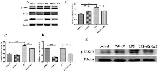 MAPK pathway may mediate the depression of rCsHscB in LPS-induced acute liver injury. (A–D) RAW 264.7 cells were stimulated with medium (negative control), rCsHscB (100 ng/mL), LPS (100 ng/mL), and LPS (100 ng/mL) + rCsHscB (100 ng/mL) for 24 h, the cells were collected and lysed, and phosphorylated proteins of MAPK including ERK, JNK, and p38 in RAW264.7 cells were detected by Western blot (A). (B) Analysis of phosphorylation of ERK by ImageJ software. (C) Analysis of phosphorylation of JNK by Image J. (D) Analysis of phosphorylation of p38 by Image J software. (E) Part of the liver of mice from the control group, rCsHscB group, LPS group, and LPS + rCsHscB group was lysed, and the phosphorylated ERK1/2 was detected by western blot. ** indicates that p value is less than 0.01; *** indicates that p value is less than <0.001, compared with indicated group.