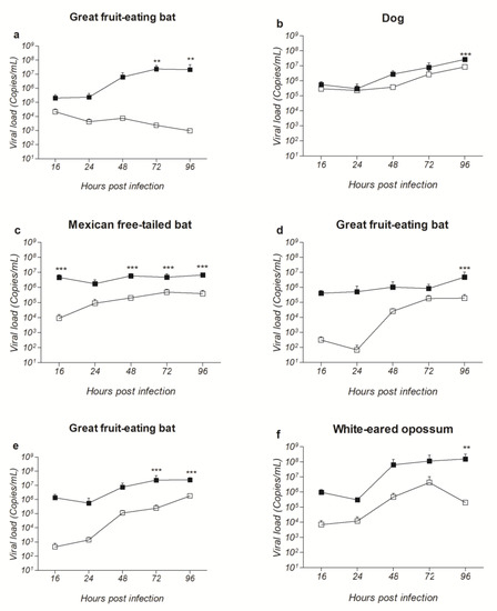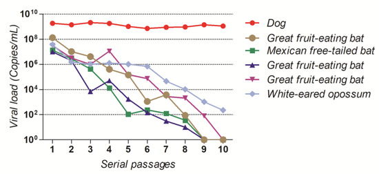 A similar pattern was observed for the dog and the Mexican free-tailed bat isolates as the differences between the variant (10th cell passage) and wild type (1st cell passage), varied close to one order of magnitude at 24, 48, 72 and 96 h p.i. (Figure 1b,c, Great fruit-eating bat and white-eared opossum isolates (Figure 1a,d–f) presented a greater increase in virus loads between the variant and wild type passages, which reached four orders of magnitude for the isolate 1069/18 at 72 h p.i. (Figure 1a).