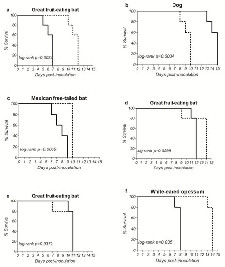 Kaplan–Meier curves. The results represent the survival after the intracranial inoculation of adult mice (five mice per sample) with the wild type (dotted lines) and variant (black lines) of field RABV isolates. (a) Great fruit-eating bat (Isolate 1069/18). (b) Dog (Isolate IP3629/11). (c) Mexican free-tailed bat (Isolate 203/21). (d) Great fruit-eating bat (Isolate 1833/21). (e) Great fruit-eating bat (Isolate 2193/21). (f) White-eared opossum (Isolate 2253/21). p < 0.05 comparing the incubation period of the wild type and the respective variant.