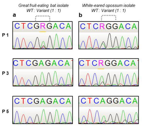 For the Great fruit-eating bat isolate, an adenine became dominant over a guanine at the second position in codon 186 already at the first passage (Figure 3a), which led to the substitution of codon GGG to GAG and the consequent amino acid substitution G186E. For the white-eared opossum isolate, a gradual guanine-to-adenine substitution at the first position of codon 186 (GGG to AGG) resulted in a G186R amino acid (Figure 3b). Thus, for both isolates, the variants became the dominant population regarding the G gene, outcompeting its wild type and suggesting that the G186E and G186R+S188P mutations contributed to the enhancement of in vitro fitness.