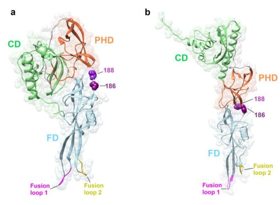 Three-dimensional model of the RABV glycoprotein. (a) Prefusion glycoprotein state. (b) Post-fusion glycoprotein state. Amino acid sites 186 and 188 located at the domain linker and the two fusion loops are highlighted. CD, Central domain; PHD, Pleckstrin Homology domain; FD, Fusion domain.