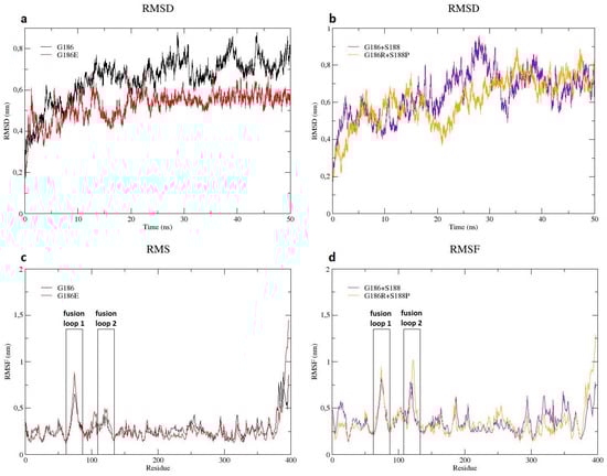 A similar result was verified for the mutant G186R+S188P and its wild type, with an increased flexibility of fusion loop 1 for the mutant protein structure. Again, residue 74 was more flexible for the mutant, with a RMSF value of 0.94 nm compared to 0.82 for the wild type. However, fusion loop 2 (amino acids 119 to 124) presented an even higher fluctuation for mutant G186R+S188P, with residue 122 being the most flexible, with a RMSF value of 1.02 for the mutant compared to 0.51 for the wild type (Figure 5d).
