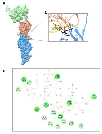 It was pointed out in the literature that an arginine at position 186 of the glycoprotein could be involved in the interaction with heparin in a laboratory-adapted RABV strain [16]. As three isolates of the present study showed a substitution to arginine in this position after cell passages, we decided to investigate whether this was true for the variants generated here. Therefore, the 3D model obtained from the putative glycoprotein sequence of the variant (10th passage in Neuro-2a cells) of isolate 2253/21 was submitted to molecular docking with heparin. The mutation G186R contributed to the formation of a positively charged pocket of amino acids that allowed the interaction with heparin, which is negatively charged (Figure 6a,b), a further indication that the 186 of RABV glycoprotein could act as a ligand for heparin. The 2D diagram showed a conventional hydrogen bond formed between heparin and R186 (Figure 2c).