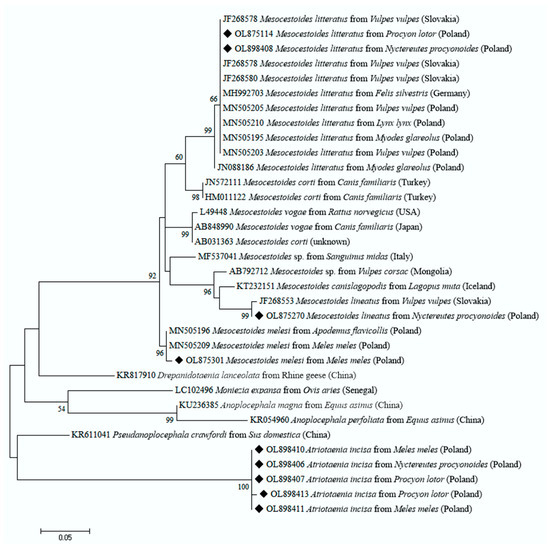 Buńkowska-Gawlik, K.; Hildebrand, J.; Popiołek, M.; Merta, D.; Perec-Matysiak, A. Copro-Molecular Identification of Tapeworms in Introduced Invasive Carnivores in Poland. Pathogens 2022, 11, 110. https://doi.org/10.3390/pathogens11020110