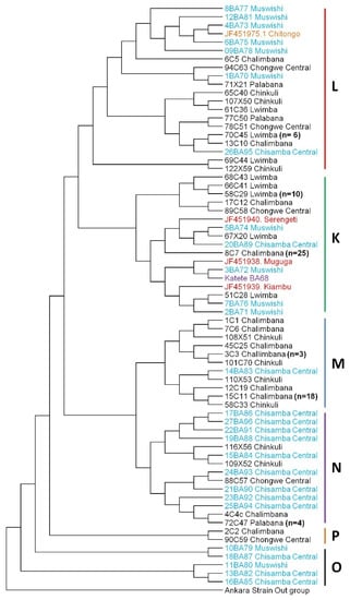 Phylogenetic analysis of the samples under study showed that 41/97 sequences from Chongwe district formed a cluster with the Muguga, Kiambu, Serengeti and Katete vaccine strains (cluster K) (Figure 1). The remaining sequences from Chongwe formed a cluster with Chitongo (cluster L, n = 15/97) and could also be found in clusters M (n = 29/97), P (n = 2/97) and N (n = 8/97) that were separate but related to the vaccine clusters K and L (Figure 1). There was no evidence of clustering according to the veterinary camp of origin of the samples within Chongwe district. With regards to sequences from Chisamba district, 5/27 clustered with Muguga, Kiambu, Serengeti and Katete vaccine strains in cluster K and 7/27 with Chitongo vaccine in cluster L. The remaining 15/27 sequences clustered in M (n = 1), N (n = 9) and O (n = 5) (Figure 1). The majority of sequences from Chisamba district formed a separate cluster N away from Muguga, Kiambu, Serengeti, Katete and Chitongo vaccine strains. Overall, phylogenetic analysis revealed that 41/97 sequences from Chongwe were similar to Muguga, Kiambu, Serengeti and Katete strains while only 15/97 were similar to Chitongo, thus Muguga cocktail and Katete strains were more represented in Chongwe district (Figure 1). With regards to Chisamba district, phylogenetic analysis showed the clustering of field samples with Muguga, Kiambu, Serengeti, Katete and Chitongo vaccine strains. However, the majority of sequences did not cluster with the vaccine groups (Figure 1). Furthermore, a DNA polymorphism and dN/dS mean ratio of π = 0.865% and 0.97 with one positive selection site and zero negative selection sites, respectively, was observed. Analysis of molecular variance (AMOVA) of both the Chongwe and Chisamba populations revealed that 92% of the genetic variation observed was within the population while 8% was among the population. Treating Chongwe and Chisamba populations as separate populations further showed that 97% and 90% of the variation was within the population while 3% and 10% were among the population for Chongwe and Chisamba, respectively.