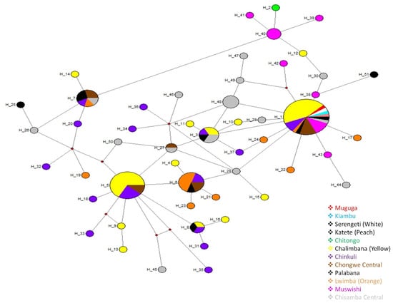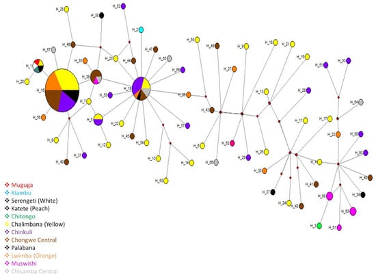 The similarity of the haplotypes between Muguga, Kiambu, Serengeti, Chitongo, Katete and the field samples was analyzed using network ver. 4.5 []. The MJ network showed that the most abundant haplotypes were H1(n = 34) and H5 (n = 18), and from these, several haplotypes were seen radiating (Figure 2).