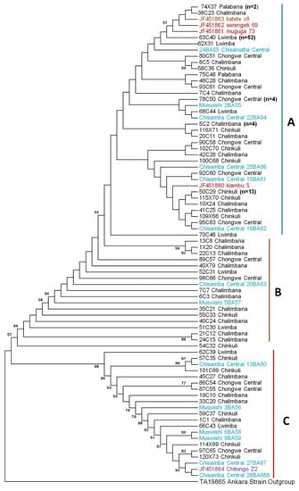 Phylogenetic analysis of the Tp2 nucleotide sequences (Figure 3) from Chongwe revealed that the majority of sequences (n = 98/128) clustered with Muguga, Kiambu, Serengeti and Katete vaccine strains (cluster A) while only 14/128 sequences clustered with the Chitongo vaccine strain (cluster C) (Figure 3).