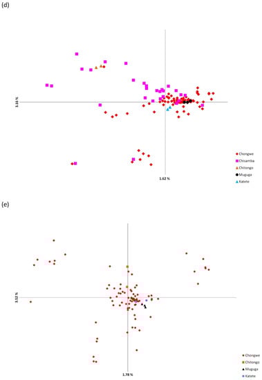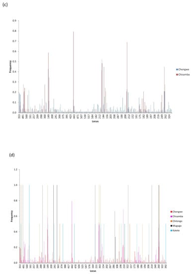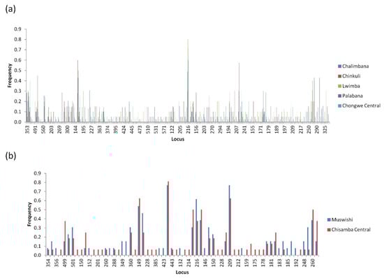 In Chisamba population, the most polymorphic markers were MS7 and MS33, each identifying 14 alleles, while the least polymorphic were MS9 and MS39, each identifying 4 alleles. Overall, the highest mean number of alleles identified was 13.2 (MS14), and the least number identified was 4.6 (MS15). High gene diversities were observed on all loci in both Chongwe and Chisamba populations except for markers MS14 and MS25, which recorded low diversities in Chisamba district (Table 2). Overall, across all loci, the highest gene diversity was 0.77 (MS33), and the least was 0.464 (MS15) (Table 2). With respect to allele frequencies (Figure 5), treating Chongwe and Chisamba district populations as single populations revealed 51 and 28 shared and 245 and 38 unique alleles, respectively (Figure 5a,b). The higher proportion of unique alleles as compared to shared alleles was indicative of genetic differentiation.