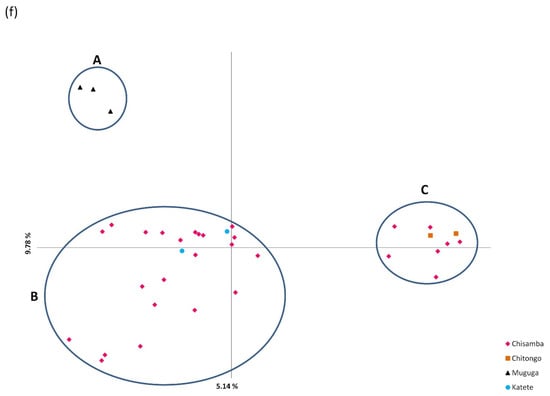 For Chongwe (Figure 6a), four distinct clusters were also observed namely A, B, C and D. The samples originated from Chalimbana, Chongwe central and Lwimba for cluster A, Chalimbana, Lwimba, Chongwe central and Palabana for cluster B, Chinkuli, Chalimbana and Lwimba for cluster C and finally Lwimba, Chongwe Central, Chikuli, Palabana and Chalimbana for cluster D (Figure 6a). When Chisamba and Chongwe populations were treated as a single population, a total of 41 shared and 209 (Chongwe = 185, Chisamba = 24) unique alleles were obtained (Figure 5c). The high number of unique alleles was suggestive of population differentiation/sub-structuring (Figure 5c). This was further investigated using PCA (Figure 6c), which showed that most of the field samples from Chongwe district occupied the lower left and right quadrants while those from Chisamba district occupied the upper left and right quadrants indicative of population sub-structuring. When all populations, including the vaccine stocks, were treated as a single population, 42 shared alleles and 242 unique alleles were observed (Figure 5d). For the sake of simplicity, we shall refer to Muguga, Kiambu and Serengeti collectively as the Muguga cocktail (MC) population in reference to all population genetic analyses performed in this study. Chongwe and Chisamba populations did not share any alleles with MC or Katete vaccine populations. However, both populations shared a total of seven alleles with the Chitongo vaccine population (Figure 5d). The population differentiation and level of similarity demonstrated by allele frequency analysis among the populations were further assessed using PCA (Figure 6d), which showed close clustering of MC and Katete populations with Chongwe populations, while the Chitongo vaccine population showed similarity with only a few samples from Chisamba district. In order to observe the patterns on PCA in finer detail, PCA of Chongwe and Chisamba populations with the respective vaccines were constructed (Figure 6e,f). The PCA for Chongwe, MC, Katete and Chitongo populations (Figure 6e) showed clustering of field samples and vaccine isolates along the middle portion of the PCA. MC and Chitongo showed some extent of sub-structuring, while Katete showed close clustering with field sample populations indicating close similarity to the field samples. With respect to Chisamba (Figure 6f), PCA showed three clusters. Cluster A, occupying the top-left quadrant comprised of the MC population only, cluster B occupying the middle part and the left upper and lower quadrants comprised of Chisamba and Katete populations and lastly, cluster C, occupying the far right upper and lower quadrants, comprised of Chisamba and Chitongo populations. The sub-structuring patterns obtained from the PCAs for Chongwe (Figure 6a,e) and Chisamba (Figure 6b,f) indicate the possible presence of distinct parasite populations circulating within these districts.