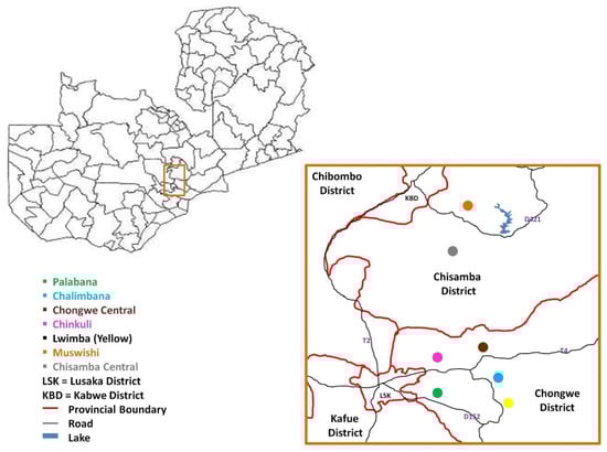 Chongwe district lies approximately 50 km east of Lusaka town within Lusaka province, and Chisamba district, in the Central province, is approximately 60 km north of Lusaka town. The study sites in Chongwe district were Lwimba, Chongwe Central, Chikuli, Palabana and Chalimbana veterinary camps, while those for Chisamba district were Chisamba central and Muswishi veterinary camps (Figure 7). In both districts, the majority of cattle are kept under free-range grazing.