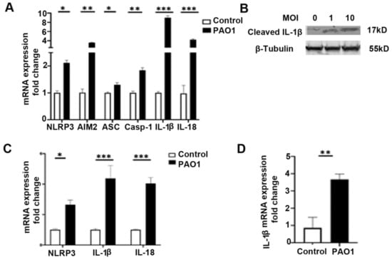 Previous studies have demonstrated that P. aeruginosa infection can induce inflammasome signaling in both myeloid and epithelial cells [4,26]. We investigated whether infection with the P. aeruginosa strain, PAO1, induced expression of components of the NLRP3 inflammasome and found that a 6-h infection significantly increased expression of NLRP3, the adapter protein ASC, caspase-1, IL-1β, and IL-18 in BEAS-2B bronchial epithelial cells (Figure 1A,B). In addition, expression of absent in melanoma (AIM)2, a distinct inflammasome receptor, was upregulated by P. aeruginosa infection (Figure 1A). Infection with PAO1 also significantly increased protein levels of cleaved IL-1β, demonstrating increased activation of the inflammasome pathway (Figure 1B). Upregulation of NLRP3, IL-1β, and IL-18 was also demonstrated in primary isolated human bronchial epithelial cells after a 6-h infection with PAO1 (Figure 1C). Male C57BL/6 mice were infected with PAO1 intranasally, and the left lung was homogenized and the measurement of the relative expression of IL-1β showed significant increase, compared to the untreated control (Figure 1D).