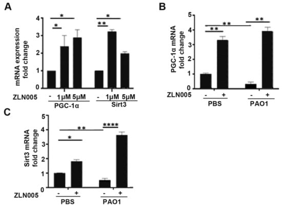 Previously, we demonstrated that small molecules targeting PGC-1α post-translational regulation rescue mitochondrial and metabolic derangements caused by P. aeruginosa infection [24]. These therapies, however, can have many off-target and pleiotropic effects. To better determine the role of PGC-1α and downstream signaling in the host response to P. aeruginosa infection, we investigated a small-molecule therapeutic called ZLN005 that was identified to be a specific and selective transcriptional inducer of PGC-1α expression [25]. We first confirmed that ZLN005 treatment at doses of 1 and 5 μM significantly increased expression of PGC-1α in bronchial epithelial cells, BEAS-2B (Figure 4A). ZLN005 also upregulates the expression of SIRT3, a downstream target induced by the transcriptional coactivator PGC-1α (Figure 4A). SIRT3 is a mitochondrial-localized deacetylase important for ROS detoxification and proper mitochondrial function [34,35]. Next, we investigated if ZLN005 could prevent the downregulation of PGC-1α and SIRT3 in epithelial cells after P. aeruginosa infection. Pretreatment with ZLN005 prevented the downregulation of PGC-1α and SIRT3 by P. aeruginosa in lung epithelial cells (Figure 4B,C).
