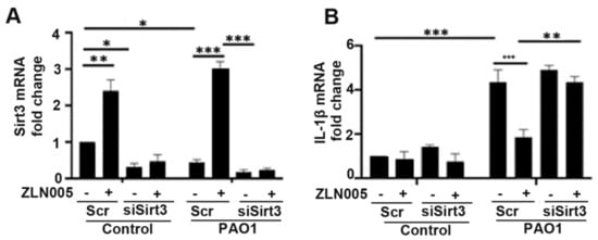 Given the role of the PGC-1α-SIRT3 axis in preventing mitochondrial damage, which is a known trigger for inflammasome signaling, we hypothesized that activation of the PGC-1α-SIRT3 pathway might abrogate inflammasome signaling in response to P. aeruginosa infection. We pretreated BEAS-2B cells with ZLN005 prior to infection with PAO1 and measured expression levels in inflammasome components. Interestingly, ZLN005 treatment prevented the upregulation of NLRP3, IL-1β, and AIM2 (Figure 5A–C). To determine whether the action of ZLN005 was dependent on SIRT3, we transfected cells with either control-scrambled siRNA or siRNA directed against SIRT3 (siSIRT3) prior to treatment with ZLN005 or vehicle control with or without PAO1. As expected, siSIRT3 prevented the upregulation of SIRT3 caused by ZLN005 (Figure 6A). ZLN005 prevented the upregulation of IL-1β caused by PAO1, but this effect was abrogated in cells deficient in SIRT3 (Figure 6B). These data suggest that SIRT3 is essential for ZLN005 activity in preventing inflammasome activation by P. aeruginosa.