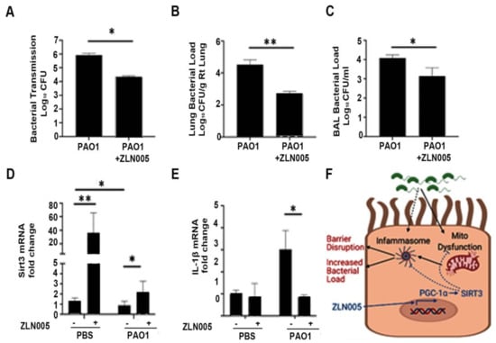 ZLN005 improves epithelial barrier function and reduces bacterial load in vivo. (A) Calu-3 lung epithelial cells were grown on transwell supports for 7–10 days to allow for tight junctions to mature. Cells were then treated with ZLN005 (1 μM) in the apical and basolateral media. After 18 h, the cells were treated with vehicle control (PBS) or PAO1 (MOI 1) in the apical chamber. After 6 h, the basolateral media was collected and serially diluted and cultured on LB agar. Colony-forming units (CFU) were recorded. N = 6. (B–E) Male C57BL/six mice, aged 8 to 12 weeks, were treated with ZLN005 (15 mg/kg body weight) or with an equivalent volume of vehicle control (methylcellulose) for three doses every 8 h for one day. At the time of the last dose, the mice were then intranasally inoculated with vehicle control (PBS) or with PAO1 (108 CFU). Mice were sacrificed after 24 h. Bronchoalveolar lavage (BAL) fluid was collected and serially diluted and used for bacterial colony counts (D). The right lung was collected, weighed, homogenized, and serially diluted on LB agar plates to quantify bacterial load normalized to the weight of the lung (C). The left lung was frozen and used for subsequent mRNA analyses to measure mRNA levels of SIRT3 and IL-1β (D,E). N = 3–6. ZLN005 attenuated bacterial transmigration across the epithelial barrier. Further, ZLN005 reduced bacterial load in an in vivo P. aeruginosa pneumonia model, rescued expression of SIRT3, and reduced IL-1β expression in whole lungs. Results are mean ± s.e.m. * p < 0.05, ** p < 0.01 vs. control by one-way ANOVA with Tukey’s multiple comparisons test. (F) Schematic representation of the effect of ZLN005 on attenuating mitochondrial dysfunction and inflammasome activation via induction of the PGC-1α-SIRT3 axis. Figure was created with BioRender.com (accessed on 30 October 2021).