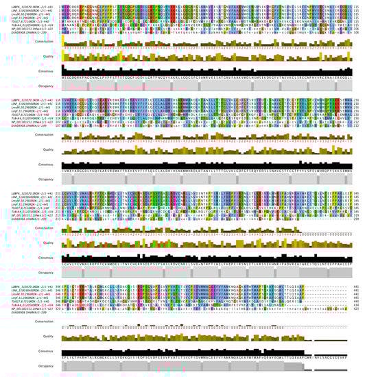 A complete open reading frame (ORF) of the L. donovani RDK2 (LdBPK_313070.1) gene (1326 bp) has been retrieved from the triTrypDB database. The gene encodes a 441 amino acid long RDK2 protein with an approximate molecular weight of 49 kDa. The homology and pan-species conservation of RDK2 have been analysed by comparing amino acid sequences of RDK2 obtained from L. infantum, L. mexicana, L. major, T. brucei, T. cruzi, and H. sapiens. The sequences were aligned using a multiple sequence alignment tool (MSA). According to the conservation peaks obtained from the MSA tool, RDK2 is conserved throughout Leishmania and Trypanosomes with the least conservation in humans (Figure 1).