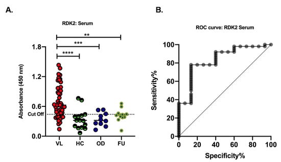 Serum-based ELISAs with recombinant antigens RDK2. (A) Sera for this study were collected from active visceral leishmaniasis patients (VL, n = 50), healthy controls (HC, n = 15) includes (non-endemic healthy controls, n = 10 and endemic healthy controls n = 05), other diseases (OD, n = 10), which included 3 samples each from malaria and viral fever, and 2 samples each from typhoid, tuberculosis patients, and follow-up (FU, n = 13). The dotted horizontal lines represent the cutoff values (0.44) for each ELISA calculated using ROC curves where the highest sensitivity and specificity were obtained. (**, p = 0.0022, ***, p = 0.0002, ****, p < 0.0001). (B) ROC curves obtained from ELISAs using RDK2 antigens for detection of antigen-specific antibodies in serum samples.