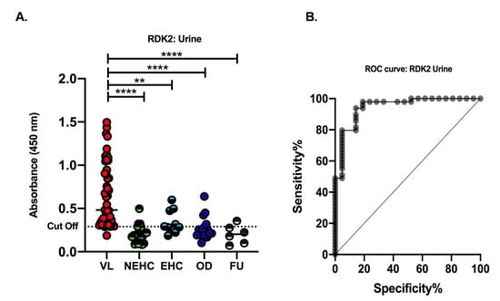 Urine-based ELISA with recombinant antigens RDK2. (A) Urine for this study collected from active visceral leishmaniasis patients (VL, n = 49), non-endemic healthy controls (NEHC, n = 21), endemic healthy controls (EHC, n = 10), other diseases (OD, n = 19), which included 5 samples each from malaria, tuberculosis, and viral fever, and 4 typhoid samples of patients and follow-up (FU, n = 6). The dotted horizontal lines represent the cutoff values (0.29) for each ELISA calculated using ROC curves where the highest sensitivity and specificity were obtained. (**, p = 0.0011, ****, p < 0.0001). (B) ROC curves obtained from ELISAs using RDK2 antigen for detection of antigen-specific antibodies in urine samples.