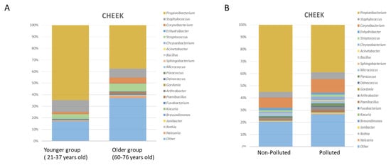 (A) Taxonomic analysis of cheek microbiome in younger and older subject’s group. Stacked bar charts showing the relative abundance of the 20 most prevalent bacterial genera. Adapted from [] (B) Taxonomic analysis of cheek microbiome (younger group) in polluted and non-polluted environment. Stacked bar charts showing the relative abundance of the 20 most prevalent bacterial genera. Adapted from [].