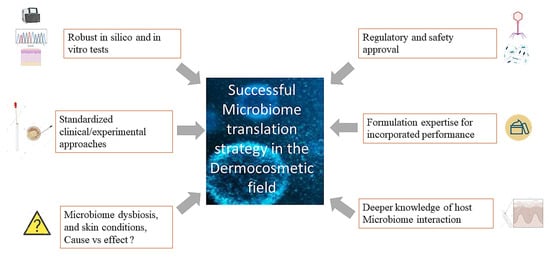 The main aim of this review is to share a global view covering mechanistic knowledge regarding the interaction between the microbiome (gut and skin) and the skin. It also focuses on how this knowledge is translated into products/concepts in the dermo-cosmetic field. The latest methodological developments for skin microbiome analysis and the specific regulatory/safety environment of microbiome-derived solutions used in the dermo-cosmetic industry are summarized. The translational challenges of the presented microbiome-based concepts are also discussed.