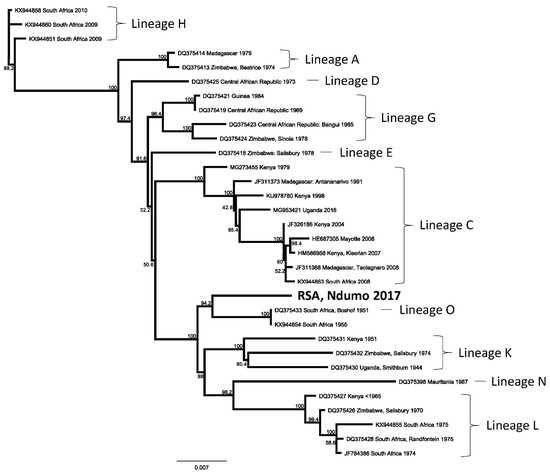 Maximum likelihood phylogenetic tree indicating the genetic relationship of the partial L segment of Rift Valley fever virus (3555 nt) detected in South Africa, 2017 (RSA_Ndumo_2017), compared to the same gene region of other sequences from GenBank, presented in a phylogram with 500 bootstrap replicates to estimate branch support. The indicated lineages follow the classification by Grobbelaar et al. [8] of the same isolates based on a 490-nt section of the Gn glycoprotein gene on the M segment. The scale bar indicates genetic distance (substitutions per site) calculated using the Tamura–Nei method.