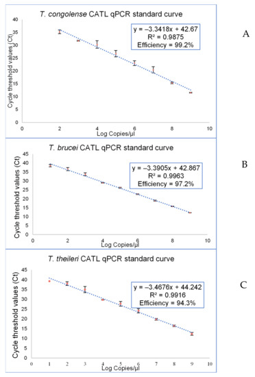 Regression analysis of each of the developed CATL qPCR assays indicated a linear correlation of log copy numbers against Ct values. The amplification efficiency in detecting parasite DNA was 99.2%, 97.2%, and 94.3%, with a correlation coefficient (R2) value of 0.988, 0.996, and 0.991 for T. congolense, T. brucei, and T. theileri, respectively (Figure 2). The T. congolense CATL qPCR assay could detect template DNA in the range of 109 copies/reaction to 102 copies/reaction, which corresponded to Ct values from 11.3 to 35.9. The amplification range for T. brucei extended from 109 copies/reaction to 101 copies/reaction with average Ct values ranging from 12.8 to 38.4. The detection limit of the T. theileri CATL qPCR assay was 102 copies/reaction which corresponded to a Ct value of 37.9.