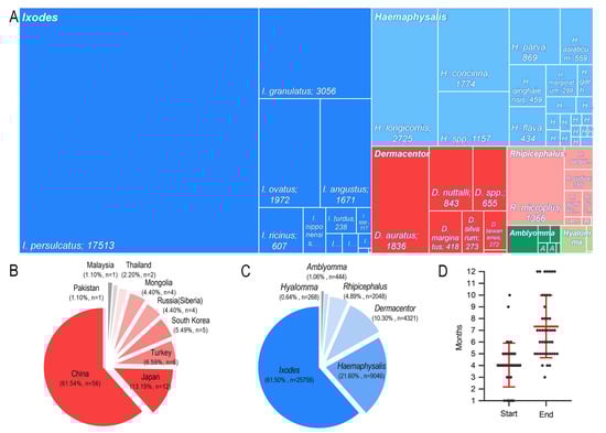 Study characteristics. (A) Rectangular dendrogram of Ixodid species. (B) Proportion of studies from each country. (C) Proportion of each genus. (D) Tick capture time.