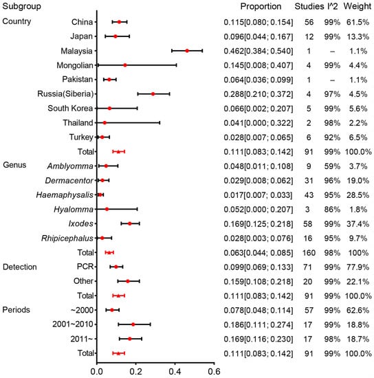 In the survey on Asian prevalence, 91 studies were conducted from nine countries, and 53,003 ticks were checked. The prevalence results were 11.5% (95%CI, 8.0–15.4%) for China, 9.6% (4.4–16.7%) for Japan, 46.2% (38.4–54.0%) for Malaysia, 14.5% (8.0–40.7%) for Mongolia, 6.4% (3.6–9.9%) for Pakistan, 28.8% (21.0–37.2%) for Russia (Siberia), 6.6% (0.2–20.7%) for South Korea, 4.1% (0.0–32.2%) for Thailand, and 2.8% (0.7–6.5%) for Turkey.