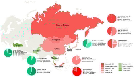 Hence, big differences in the species and genera of Ixodidae in different countries were documented. Ixodes and Haemaphysalis were the main genera in China, Japan, South Korea, Turkey, and Siberia. Dermacentor was the genus with the largest proportion in Mongolia. Rhipicephalus was distributed in China, South Korea, Turkey, and Pakistan, but the Rhipicephalus tested number was relatively small. Amblyomma was distributed mainly in Thailand, South Korea, and Malaysia. Hyalomma was found only in Turkey and Pakistan. In all studies, China accounted for 61.5% of the weight and contributed significantly to the results of the study. Only one study was done in Malaysia, so we had doubts about the high rate of infection documented in that study (Figure 5).