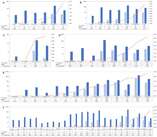 Infection rate according to species. (A): Amblyomma infection rates; (B): Dermacentor infection rates; (C): Hyalomma infection rates; (D): Rhipicephalus infection rates; (E): Ixodes infection rates; (F): Haemaphysalis infection rates; event: ticks that test positive for spirochetes were shown as light blue; n: total number of ticks detected were shown as blue; proportion: Borrelia-positive rate.