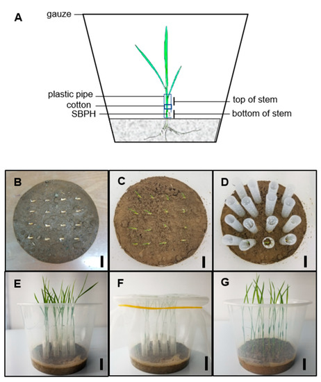 Graphic illustration of rice virus inoculation method in a specific site on rice plants. (A) Model of inoculating virus at the bottom (2 cm from soil surface) of the plant stem. (B–G). Photographs of the process of inoculating rice virus in a determined site. Rice seeds were placed in a Petri dish to soak seeds to accelerate germination. After germination, they were sown in 1.5 L disposable plastic pots with a round bottom of 14 cm diameter. Sixteen seeds were sown in each pot at a spacing of 2 cm (B). After the rice seedlings grew for 3 days (C), a transparent plastic tube of 1.5 cm diameter and 5 cm length with holes on the tube wall was placed over it (D) to make the rice seedlings grow along the tube. When the seedlings grew to 1.5 leaf age (10 d after sowing), the viruliferous rate of SBPH was tested, the actual number of SBPH required was calculated according to the effective inoculation number per plant, and the SBPH was placed at 2.0 cm base of the rice seedling stem. Cotton was used to block the position above 2.0 cm of the stem base (E) and the pot was covered with gauze after inoculation (F). After 3 days of inoculation, all SBPHs were removed, and the plastic tubes were removed. The rice seedlings were placed in a greenhouse at 28–30 °C and grown under artificial light with a 14 h light/10 h dark cycle (G). Scale bars, 2 cm for (B–G).