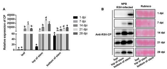 RSV was inoculated on the bottom stem of NPB using the determined-part inoculation approach, and the transcription and accumulation levels of RSV-CP were detected during the infection process. The results showed that from the initial day of inoculation, the accumulation of RSV-CP at the bottom of the stem of NPB plants increased significantly from the previous time point every 7 days thereafter, and reached a peak at 28 days after inoculation (Figure 2A). RSV-CP at NPB-inoculated sites showed a continuous growth trend, indicating that this approach can demonstrate the accumulation of RSV-CP at the invasion site.
