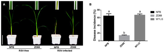 Resistance of the tested cultivars to RSV are indicated by symptoms and disease incidence. (A) Rice stripe virus (RSV) symptoms on NPB and Zhendao88 plants. Scale bar, 10 cm. (B) Disease incidence in NPB and Zhendao88 plants following RSV inoculation after 28 days. Wuyujing No. 3 (WYJ3) was used as the susceptible control. All data are shown as mean values ± SD error bars. Different letters on bar graphs indicate significant differences by Duncan’s multiple range tests; p < 0.01.