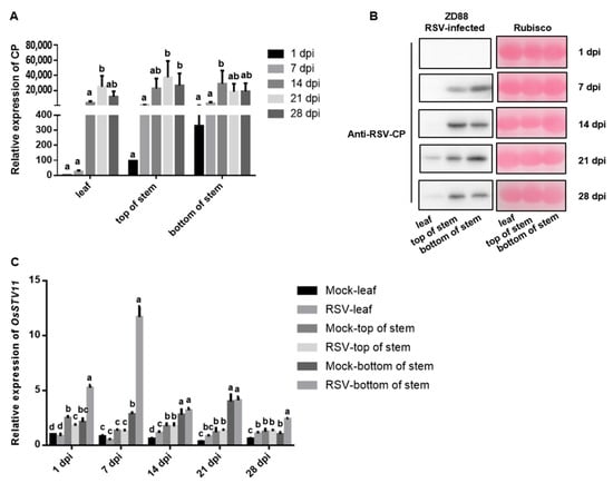 RSV-CP accumulation and spatiotemporal expression of RSV resistance genes OsSTV11 in different parts of Zhendao88 after RSV infection. (A) Relative expression of RSV-CP in different parts of ZD88 plants based on qRT-PCR analyses in which the average expression level of RSV-CP in the leaves at 1 dpi was set as 1 to estimate relative levels of gene expression in other parts of plants. (B) The expression level of RSV-CP in different parts of ZD88 plants by Western blot. (C) Relative expression of OsSTV11 in different parts of RSV-free and RSV-infected ZD88 plants based on qRT-PCR analyses in which the average expression level of OsSTV11 in the leaves of mock plants at 1 dpi was set as 1 to estimate relative levels of gene expression in other parts of plants. All data are shown as mean values ± SD error bars. Different letters on bar graphs indicate significant differences by Duncan’s multiple range tests; p < 0.01.